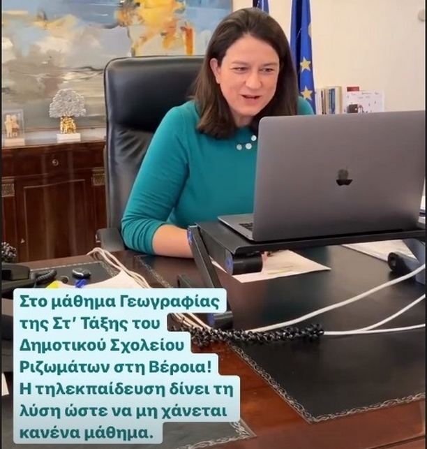 «Η Υπουργός Παιδείας επισκέφθηκε σήμερα την ψηφιακή τάξη του Δημοτικού Σχολείου Ριζωμάτων. Στην ορεινή περιοχή των Πιερίων της Ημαθίας, με τα συχνά ακραία καιρικά φαινόμενα στη διάρκεια του χειμώνα, δε χάνεται πλέον ούτε μια ώρα μαθήματος. Ευχαριστούμε πολύ τη κ. Νίκη Κεραμέως που είναι πάντα κοντά μας, συγχαρητήρια στα παιδιά και στους δασκάλους όλων των ειδικοτήτων για την άμεση προσαρμογή στα δεδομένα της τηλεκπαίδευσης.»